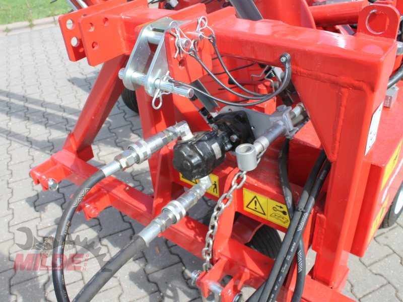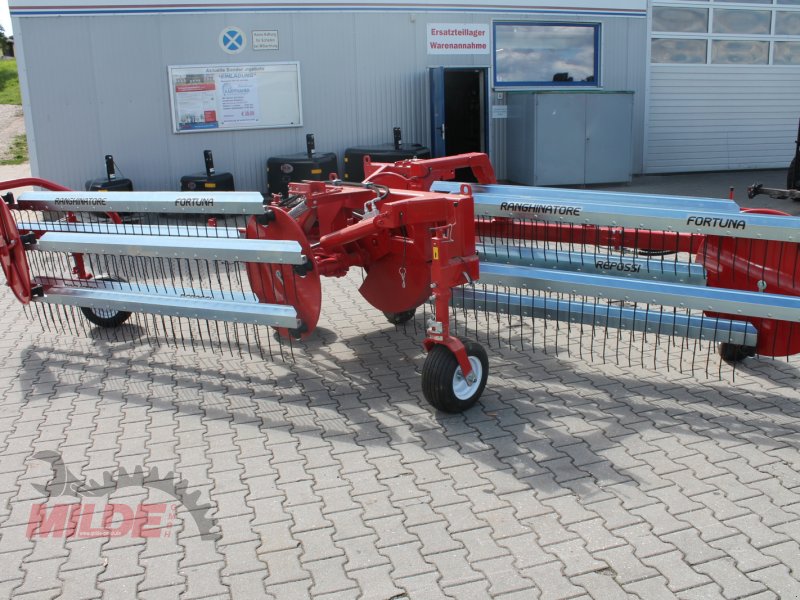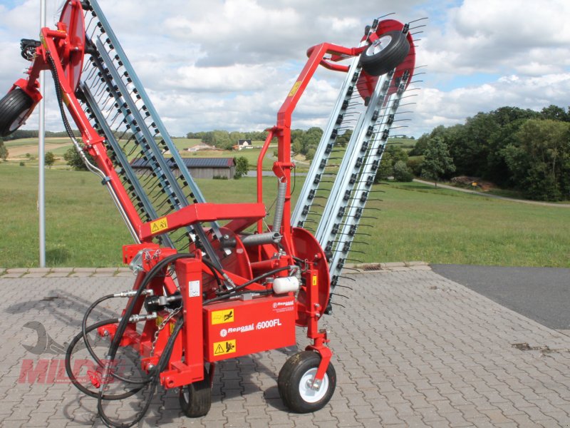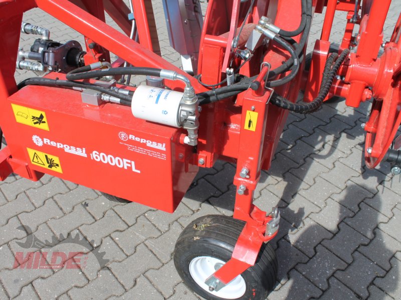 Repossi Doppelschwader FL 6000 Big (Frontmontage) für Traktoren mit Fronthydraulik: Doppelschwader für Seitenschwad, kann vorne oder hinten am Schlepper montiert werden, mit 10 Haspeln (je 15 Zähne), Klappung über das Hydrauliksystem des Traktors (1xDW), Transportbreite 2.54 m, Arbeitsbreite 6.00 m, Transporthöhe 2.96 m. Vier Räder 16x6.50-8 und ein Rad 15x6.00-6.